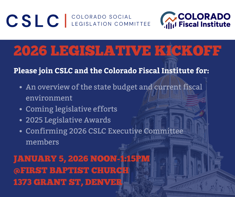 Established in 1971, the Colorado Social Legislation Committee (CSLC) is a coalition of persons and organizations interested in legislation related to human needs and services, especially at the state level. CSLC is a nonpartisan and all-volunteer organization that works to create a better future for Colorado.