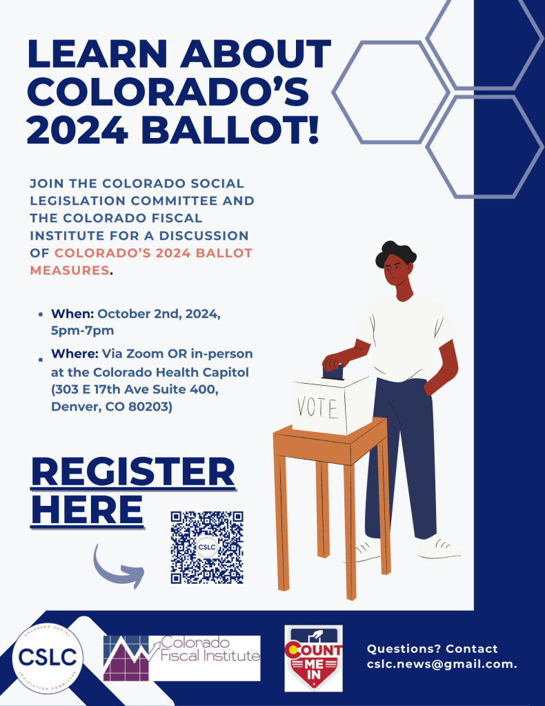 The Colorado Social Legislation Committee, in partnership with Caitlin Schneider from Colorado Colorado Fiscal institute and Count Me In, recently hosted a discussion to educate voter’s on Colorado’s 14 statewide ballot measures. The event, held on Wednesday, October 2nd from 5-7pm, offered both an in-person option at the Colorado Health Capitol and a Zoom option for those wanting to attend virtually.